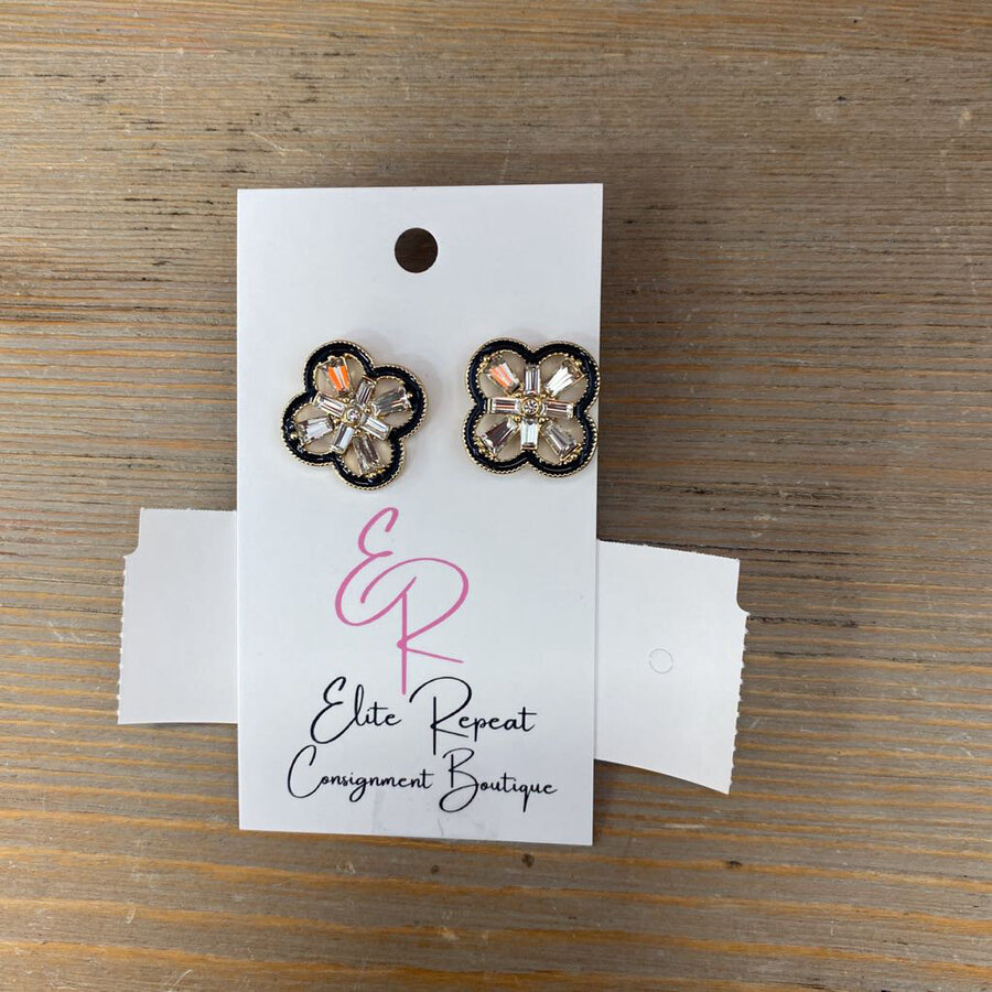 CZ Floral Spark Stud Earrings with Black Enamel NEW - $18.25