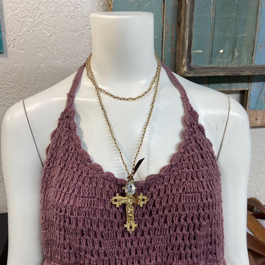 Tan Bead Necklace with Cross Pendant